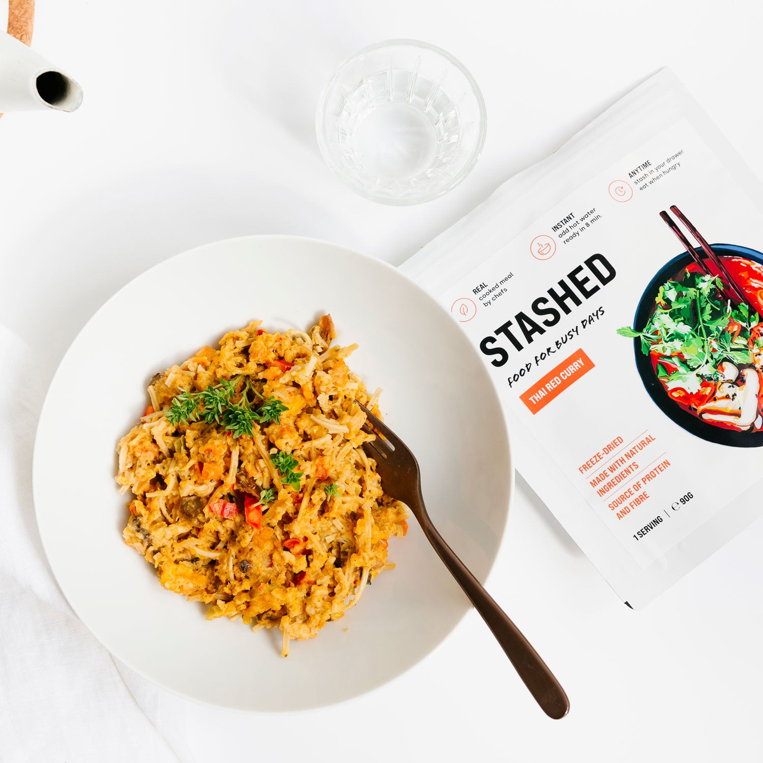 Stashed meals are freeze-dried meals, made with fresh ingredients. For lunch or as dinner, they help you if you want to eat healthy on busy days. You can store Stashed meals on a shelf or in a drawer. Just add hot water, wait a few minutes, and it’s ready.